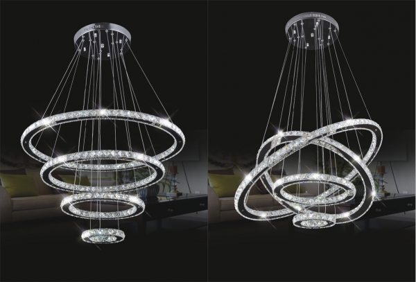 Đèn chùm pha lê 4 vòng hiện đại: Hấp dẫn hơn một bước. Đèn chùm pha lê, được cắt chính xác này có thể nằm phẳng hoặc tạo thành các hình dạng với các vòng tròn đồng tâm của nó. Khung thép không gỉ của nó được bảo hành 36 tháng.
