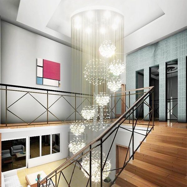 Đèn chùm kính cho cầu thang: Bạn có muốn lắp trần siêu cao không? 11 quả cầu pha lê tạo nên thiết kế trang nhã này, được treo trên xà nhà từ một đế thép không gỉ.