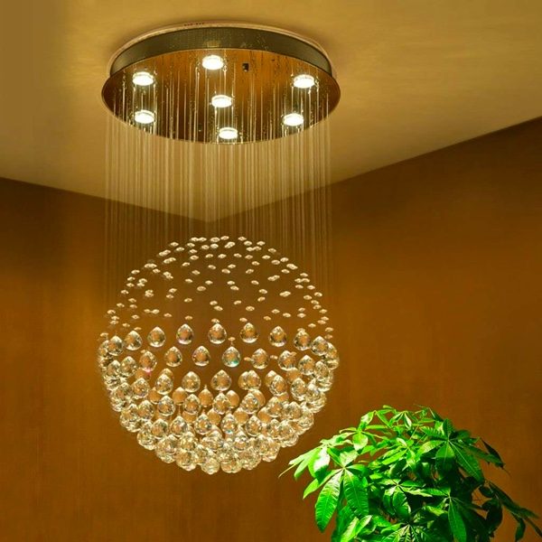 Đèn chùm phòng ăn hình cầu: Bạn có muốn sự chiếu sáng đồng đều của đèn gắn chìm với sức hấp dẫn nổi bật của đèn chùm không? Thiết kế này có các hạt mưa bằng thủy tinh pha lê treo trong một hình cầu hoàn hảo, một cách tuyệt vời để căn giữa tại một bàn ăn nhỏ.