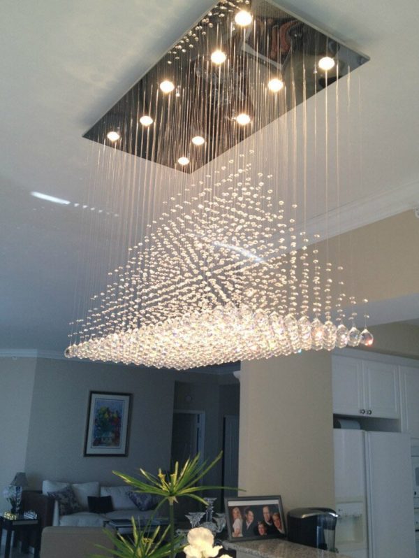 Đèn chùm pha lê hình chữ nhật hạt mưa: Đối với những chiếc bàn dài hơn, hãy xem xét hình chữ nhật này dựa trên khái niệm giọt mưa pha lê. Những viên pha lê có nhiều mặt tinh xảo lấp lánh dưới ánh sáng mang đến vẻ quyến rũ ngay lập tức cho không gian ăn uống trang trọng.