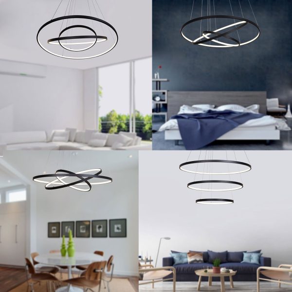 Đèn chùm led 3 vòng có thể điều chỉnh hình dạng hiện đại: Đây là một tùy chọn đèn chùm vòng nhỏ hơn. Các dây có thể điều chỉnh cho phép bạn chọn chiều cao của vật cố định cũng như cấu hình của các vòng. Vòng lớn nhất có đường kính 31,5” trong khi vòng nhỏ nhất chỉ 15,75”. Thiết kế này bao gồm một điều khiển từ xa với bộ điều khiển hẹn giờ, nhiệt độ màu và độ sáng.
