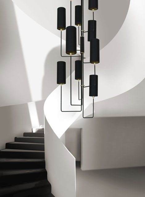 Đèn chùm Grand Vortex được thiết kế bởi Martin Huxford Studio. Chiếc đèn chùm tiên phong này mang đến phong cách độc đáo cho cầu thang, với những cánh tay không đối xứng mảnh mai và những mảng màu cong thẳng đứng tương phản.