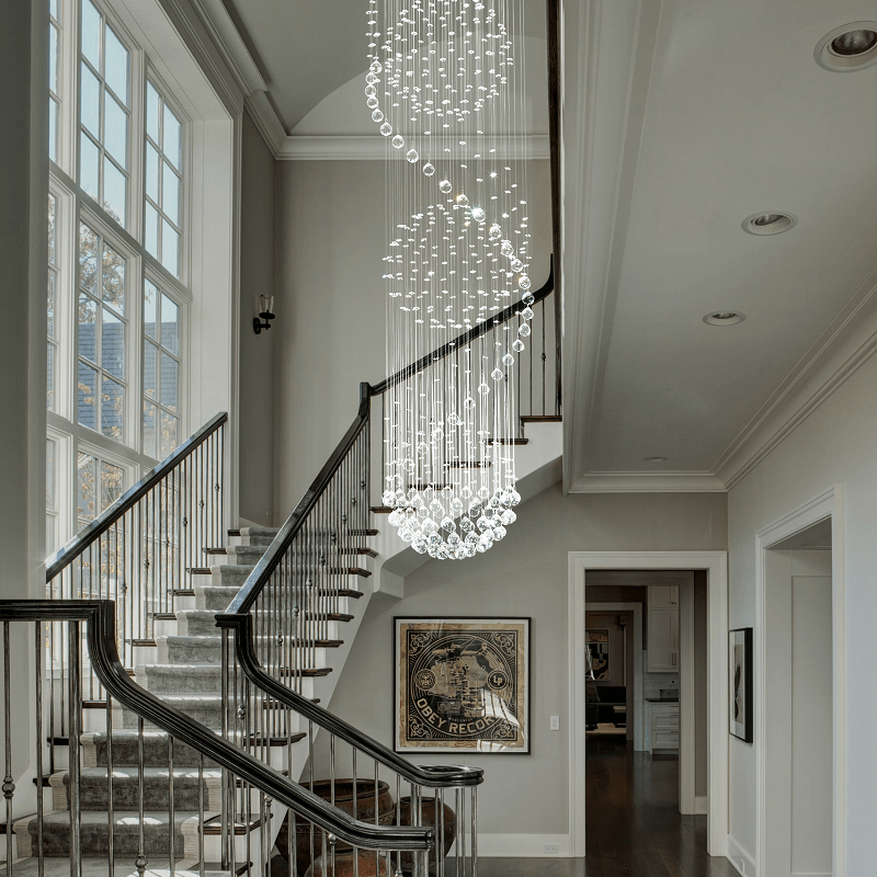 Cho ảo ảnh bồng bềnh trong không khí với những giọt nước mắt pha lê của anh ấy. Ánh sáng xoắn ốc ngoạn mục này tạo ra ánh sáng ở giữa cầu thang, đó là điều mà rất nhiều người mơ ước khi chúng tôi nói về đèn chùm cầu thang.