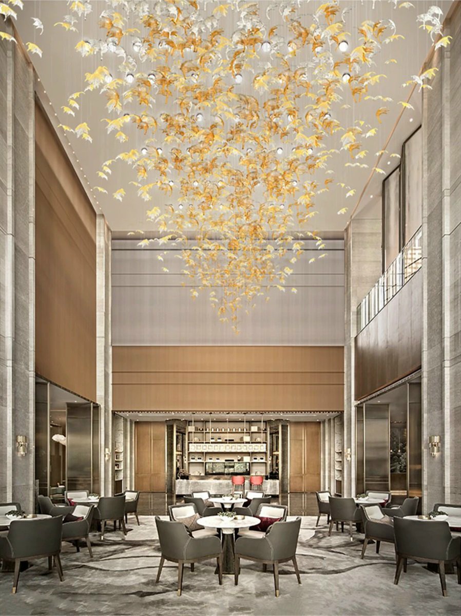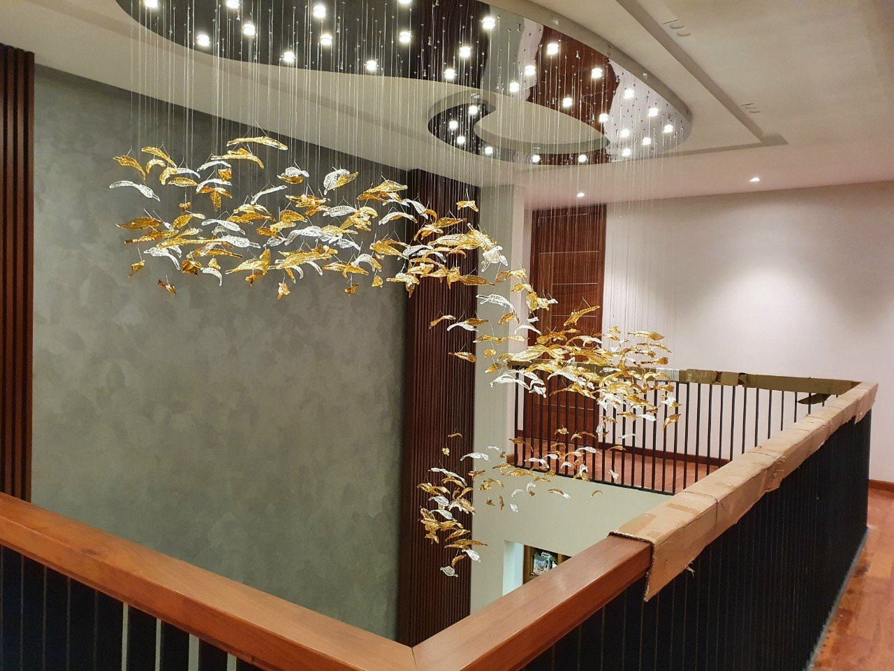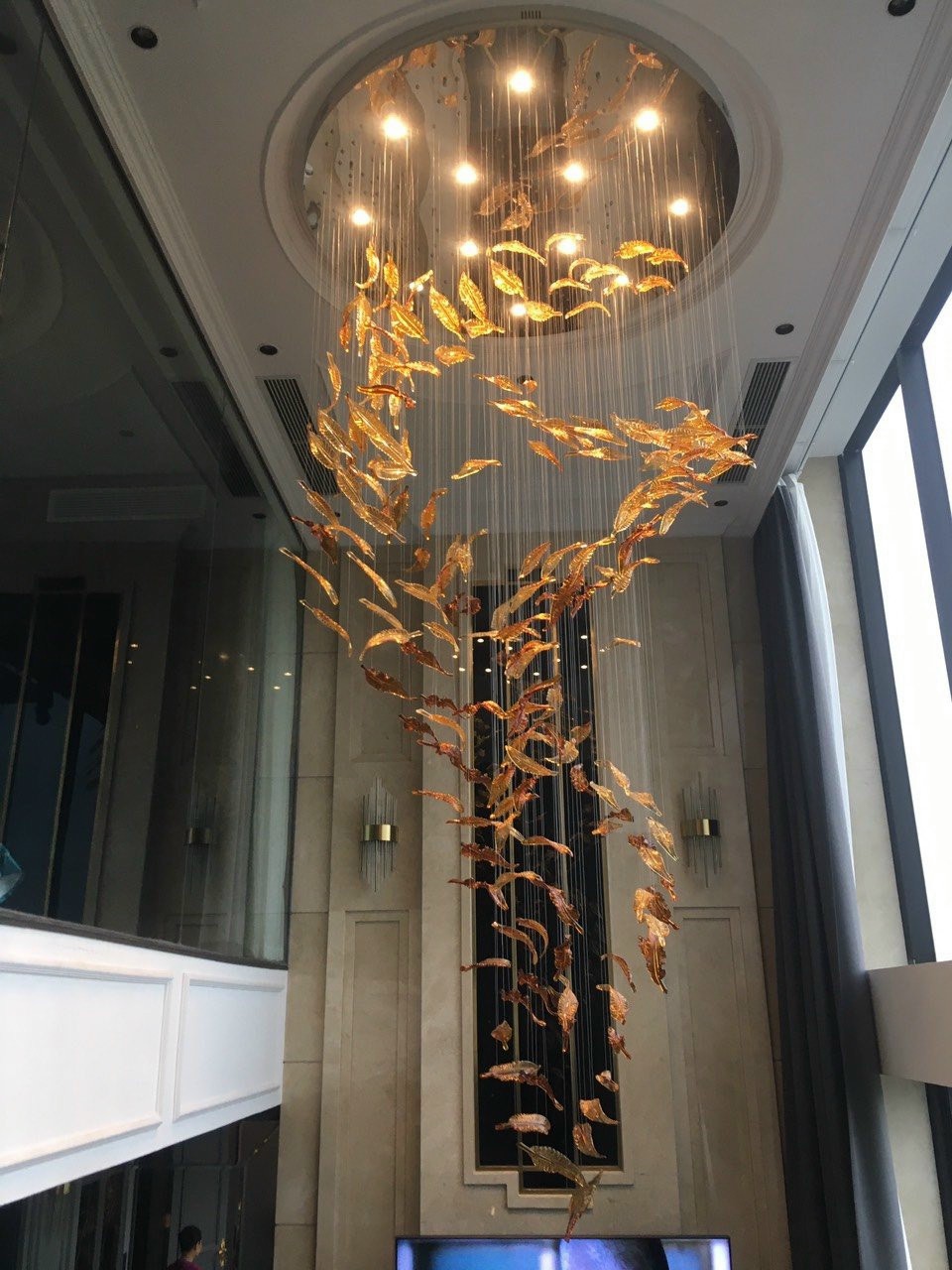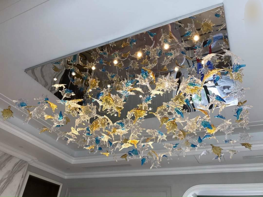 Lấy cảm hứng từ vẻ đẹp của những lá mùa thu tự nhiên chiếc đèn chùm nghệ thuật được thiết kế với sự kết hợp của các lá thủy tinh có kích thước khác nhau.