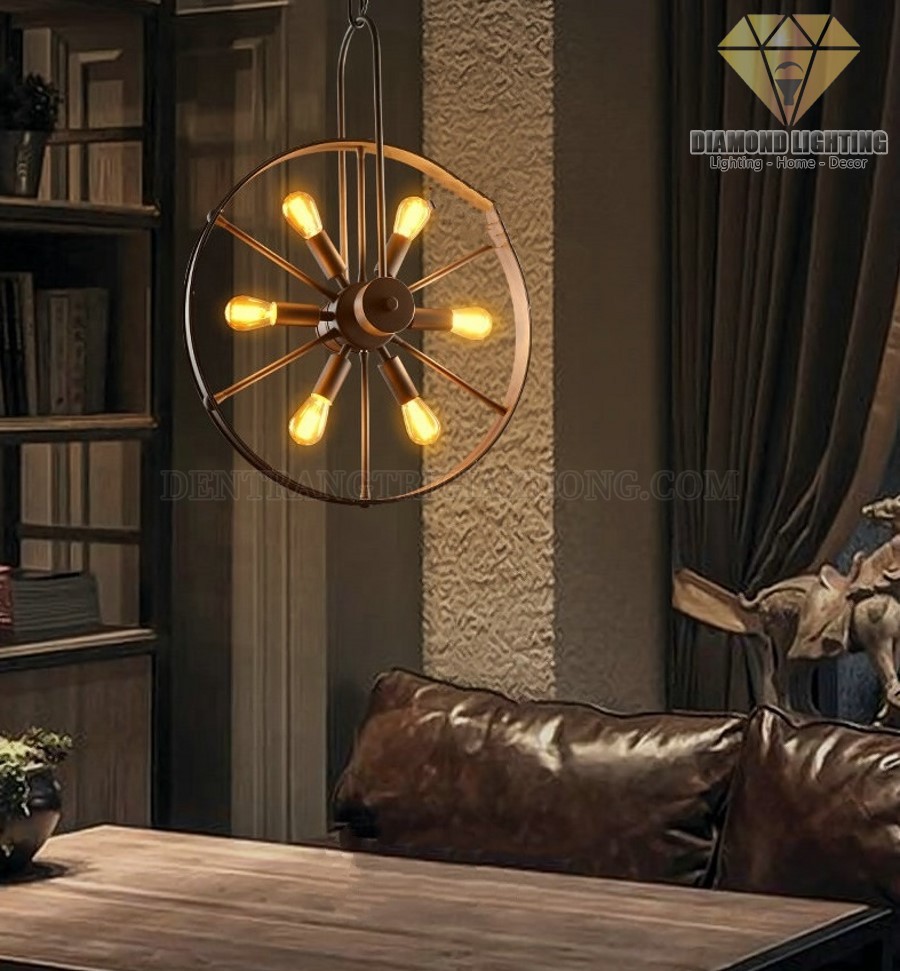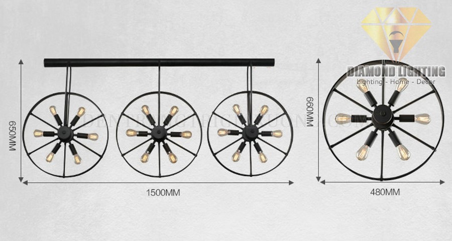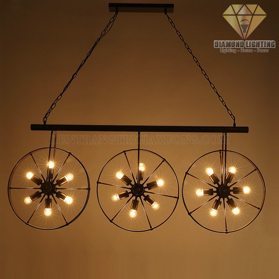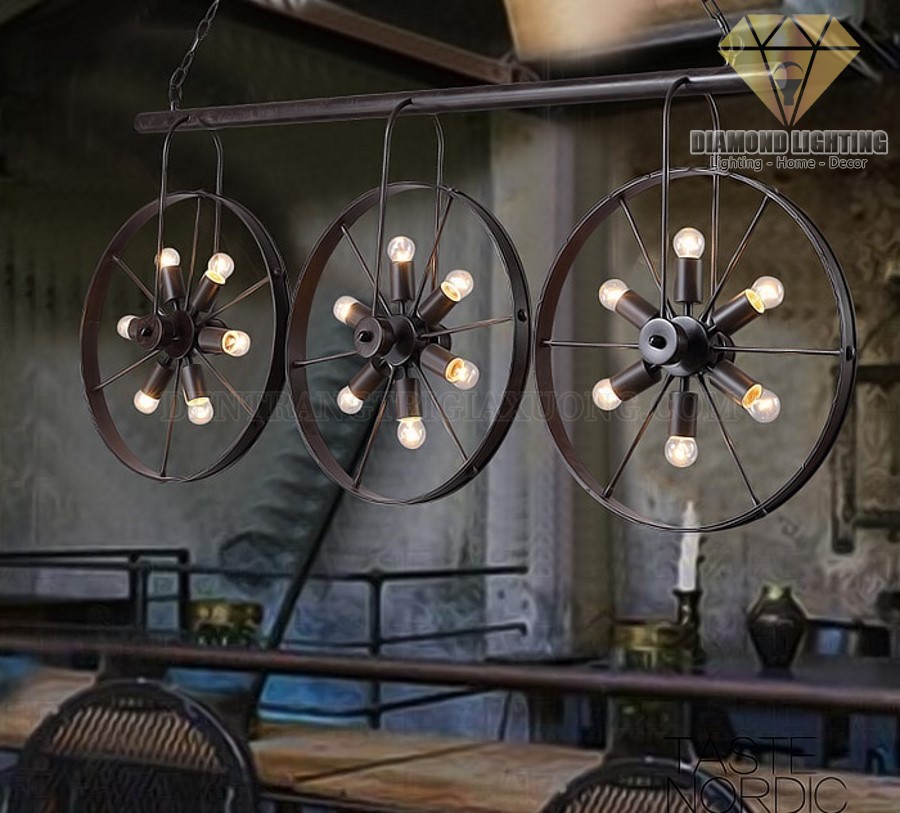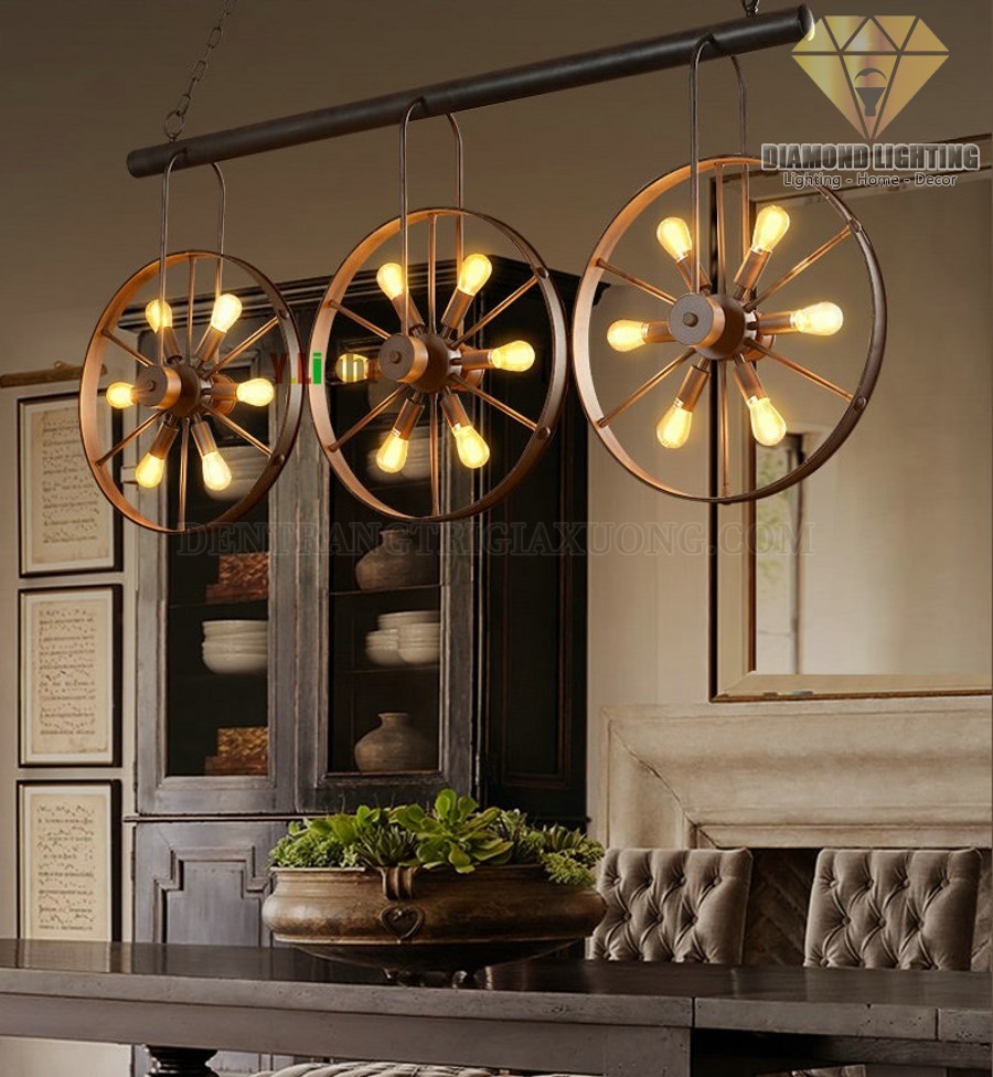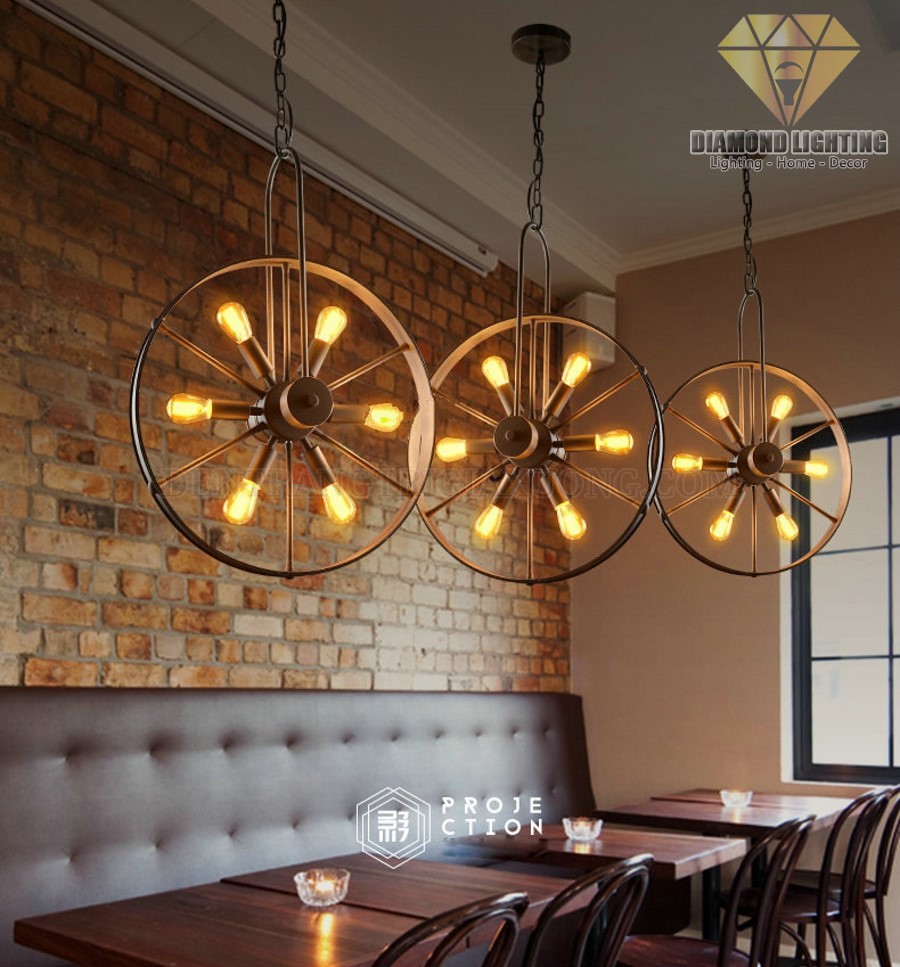 Trang trí quán cafe thả bộ 3 bánh xe DTCF032 thường được thả ở trung tâm phòng khách, giữa bàn ăn hoặc trung tâm phòng ngủ. Vừa làm đèn chiếu sáng, vừa làm đèn trang trí.