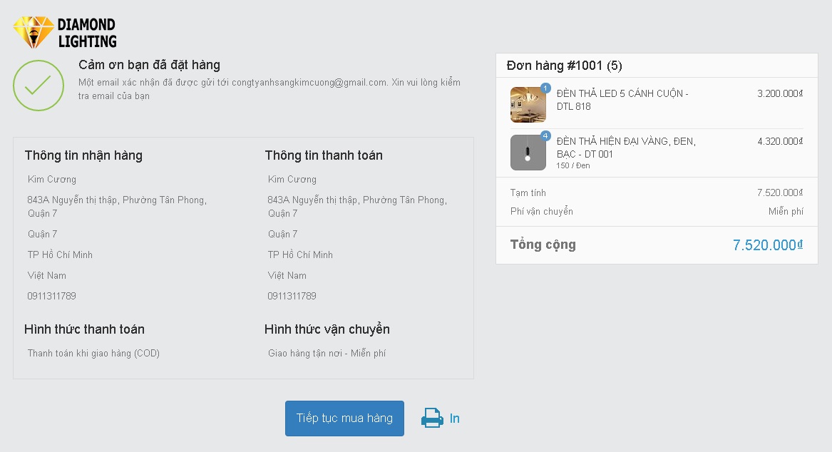 Một email xác nhận đơn hàng đã được gửi tới địa chỉ mail của quý khách. Nhân viên chúng tôi sẽ liên hệ với quý khách để xác nhận thời gian và địa chỉ giao hàng. Quý khách sẽ nhận được sản phẩm trong vòng 3 - 5 ngày ( Kể cả CN ).
