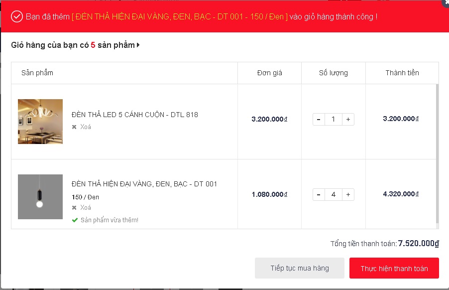 Một cửa sổ hiện lên để giúp quý khách kiểm tra lại giỏ hàng, quý khách hãy nhấn vào nút "Thực hiện thanh toán" để chuyển sang bước tiếp theo.