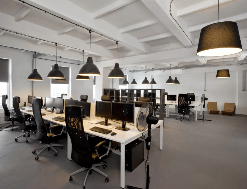 Phòng làm việc đòi hỏi phải có nguồn ánh sáng đầy đủ và ổn định để không làm ảnh hưởng đến sức khỏe thị giác của các thành viên. Bạn có thể sử dụng luồng ánh sáng trắng từ đèn LED hoặc đèn huỳnh quang để lắp đặt cho khu vực này. Tất cả các đèn phải có chao để người ngồi làm việc với tư thế nhìn ngang không bị lóa mắt bởi ánh sáng trực tiếp từ bóng đèn, đồng thời ánh đèn không được chiếu vào màn hình máy vi tính. Bên cạnh đó, bàn làm việc bắt buộc phải có nguồn sáng trực tiếp, có thể sử dụng các loại đèn bàn hoặc đèn thả ở đặt ở vị trí cách bàn khoảng 40 – 70 cm.