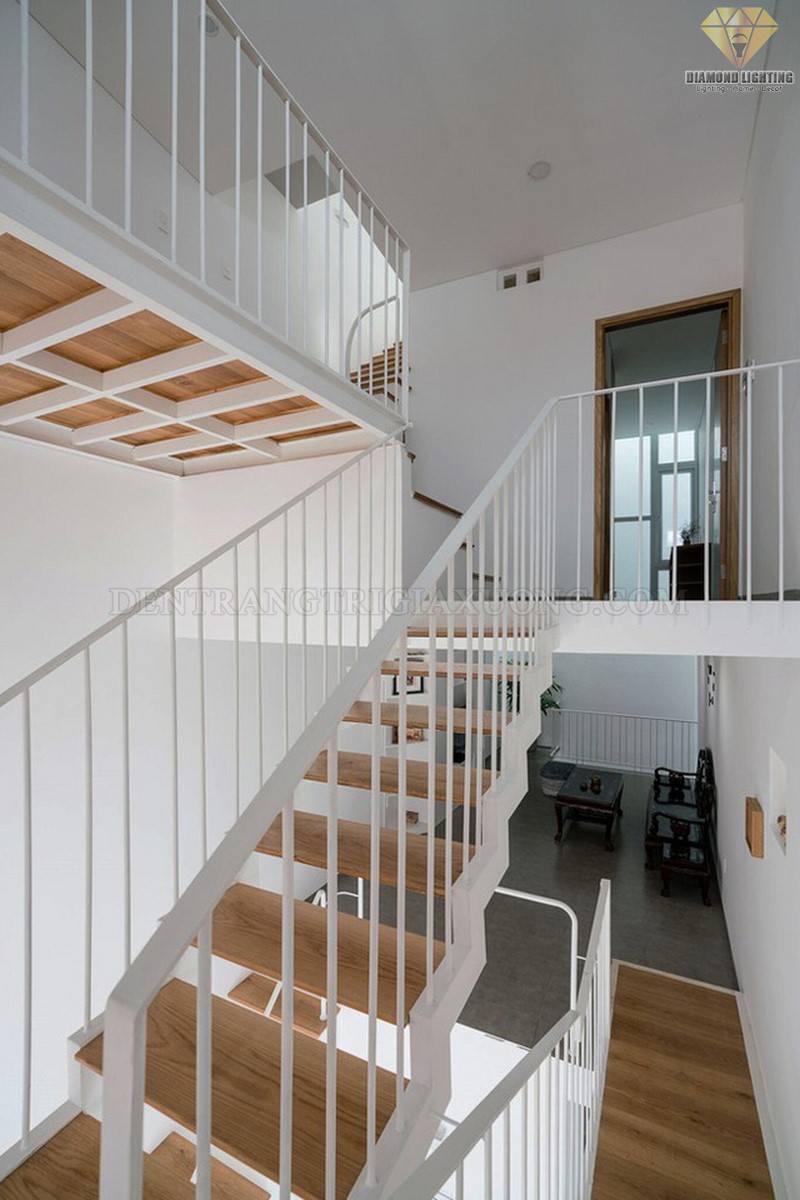 Các nhịp cầu thang mỏng manh xen kẽ nhau như một điểm nhấn trong nhà giúp kết nối các không chức năng với nhau.