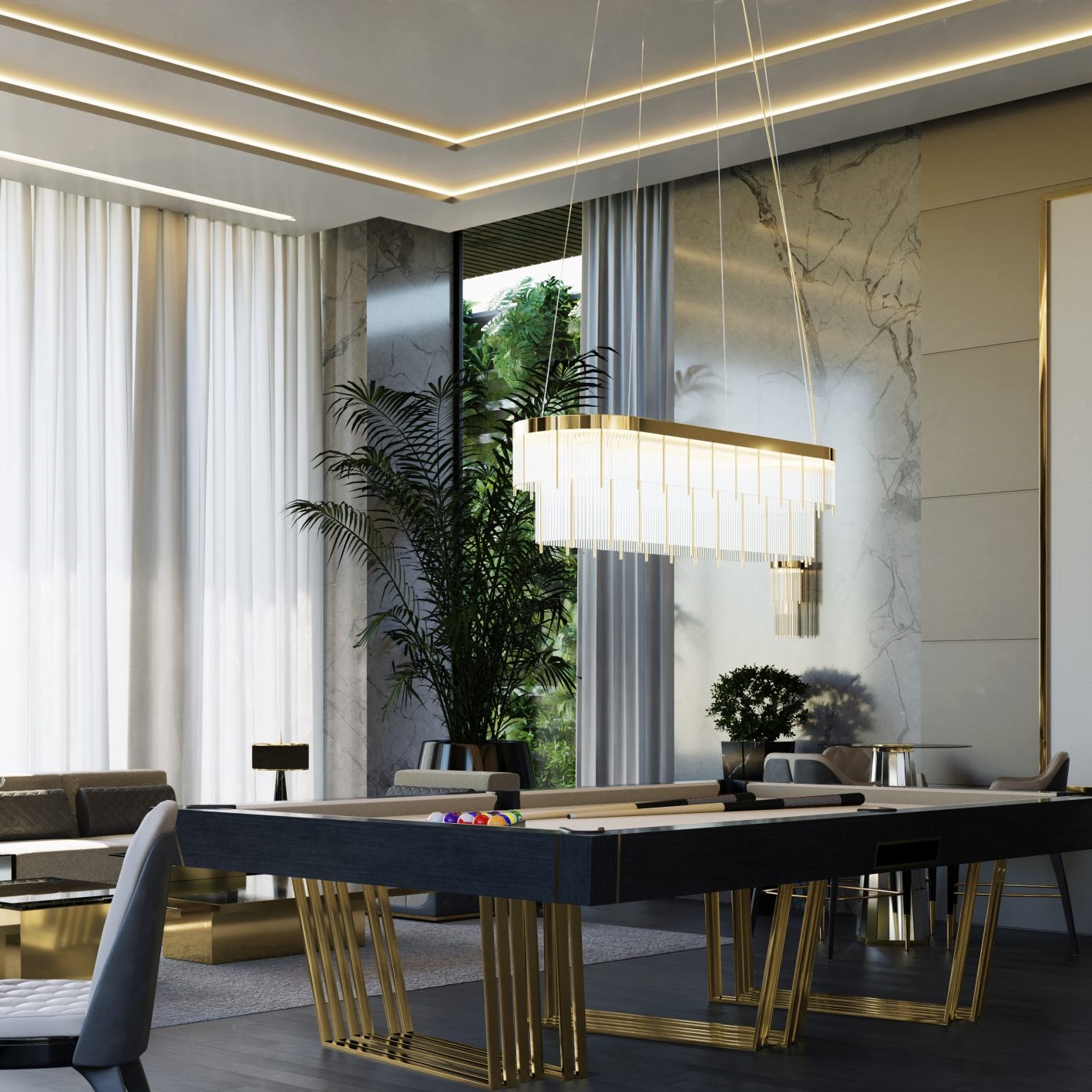 Đúng như tên gọi, những món đồ tuyệt vời này ban đầu được thiết kế để tích hợp đẹp mắt phía trên bàn, sức hấp dẫn thị giác của chúng đến từ hình dáng dài vuông vắn hoàn hảo với món đồ nội thất đặc trưng của bất kỳ phòng giải trí nào. Một chiếc đèn treo trang nhã được làm bằng thủy tinh cristal chất lượng cao hoàn hảo làm chói mắt không gian này đồng thời theo nguyên bản của nó.