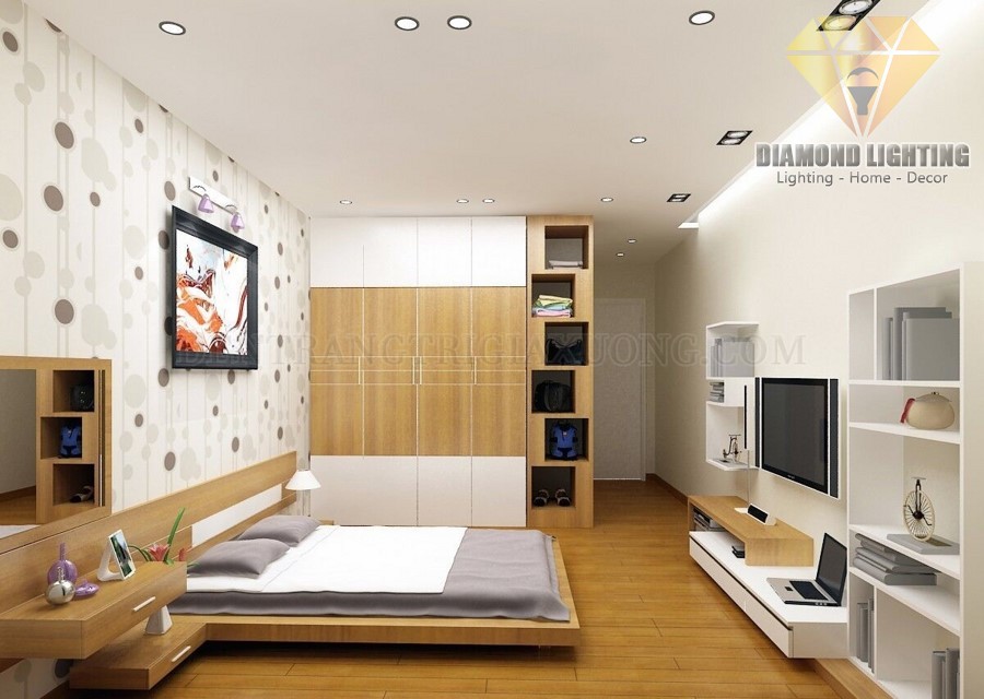 - Có thể sử dụng đèn âm trần để làm ánh sáng chính. Việc sử dụng đèn âm trần trong phòng ngủ có thể giúp bạn tiết kiệm diện tích đi rất nhiều.