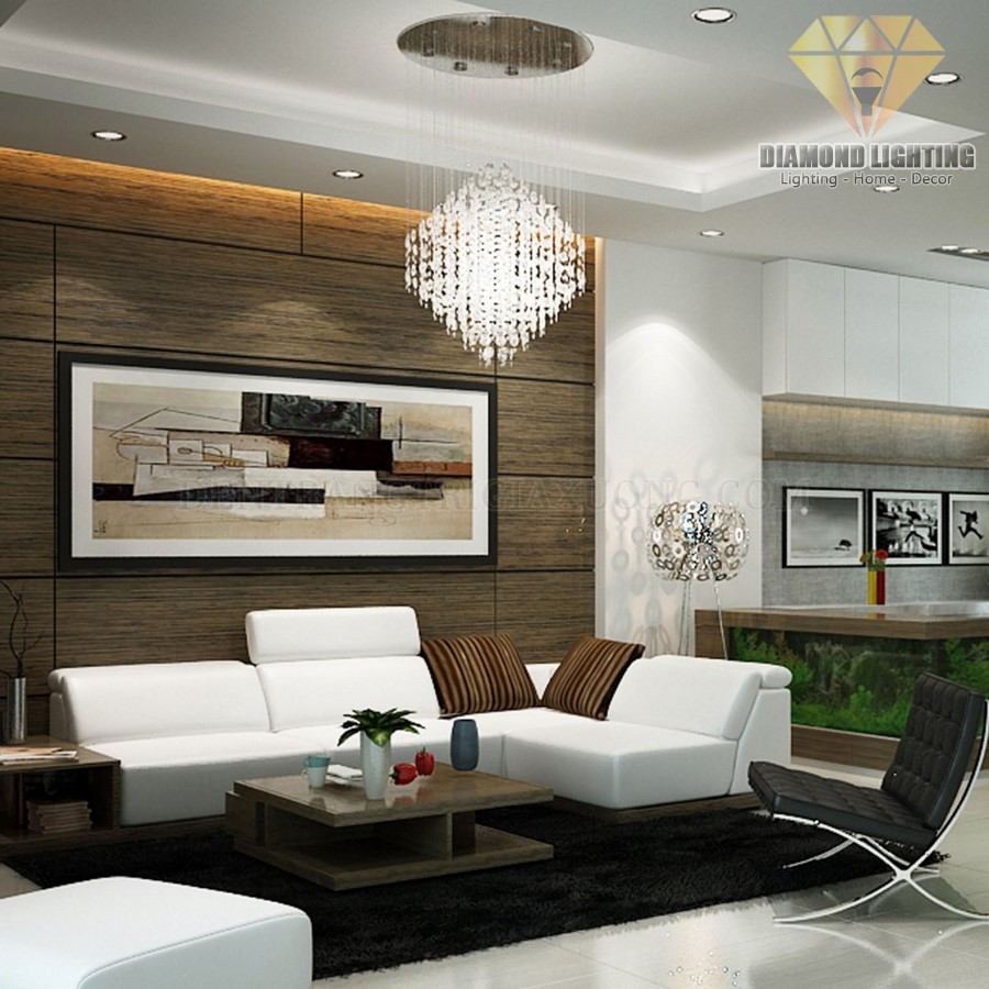 Nguồn sáng chính thường được bố trí trung tâm phòng khách, bạn có thể sử dụng đèn chùm, đèn thả hoặc đèn ốp trần để làm nguồn sáng chính.